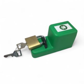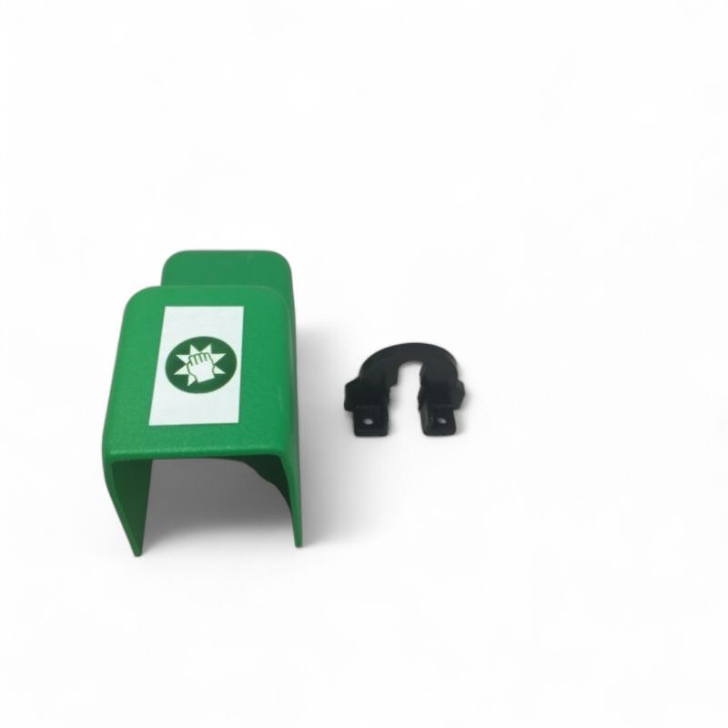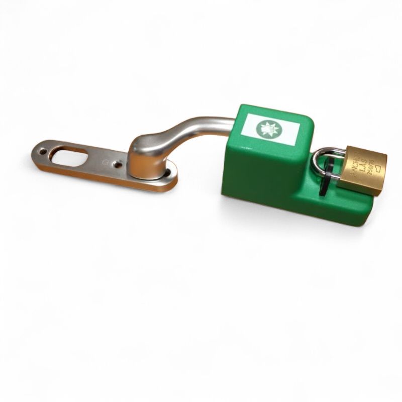 Utrymningskåpa i grön plast. Monteras över nederdelen på fönsterdörr/fönsterhandtag. Låses fast med hänglås. Avsett att markera utrymningsväg/öppning.
